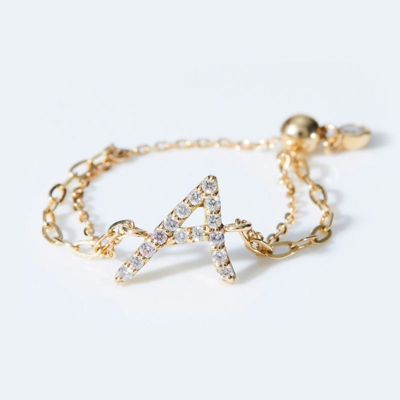 あなたのイニシャルにナチュラルダイヤモンドを散りばめた特別なチェーンリング。 二つに重なった異なるサイズのチェーンが、繊細に手元を彩ります。 アジャスタートップには光穴があり、より一層輝きます。