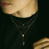 楔形モチーフの留め具は、この不確実な世の中に導きをもたらす光をイメージしてデザインしました。留め具は、3面全てにダイヤモンドを贅沢にあしらっていますので、どの角度から見ても輝きを放ちます。またチェーンにもこだわり、懇意のチェーン職人にチェーンのコマ数計算を依頼し、楔型のモチーフがなるべく絡まりにくく、動作に合わせて理想的に揺れ動く設計をしています。