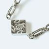 楔形モチーフの留め具は、この不確実な世の中に導きをもたらす光をイメージしてデザインしました。留め具は、3面全てにダイヤモンドを贅沢にあしらっていますので、どの角度から見ても輝きを放ちます。またチェーンにもこだわり、懇意のチェーン職人にチェーンのコマ数計算を依頼し、楔型のモチーフがなるべく絡まりにくく、動作に合わせて理想的に揺れ動く設計をしています。