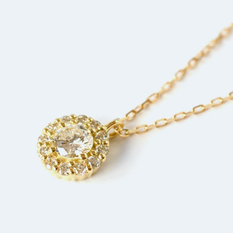 0.1ctのラウンドブリリアントカットのダイヤモンドにメレダイヤを取巻いて、センターストーンがより輝くデザインになっています。このデザインは昔からあるもので、より多くの方が違和感なく、どんなTPOでも着けられます。