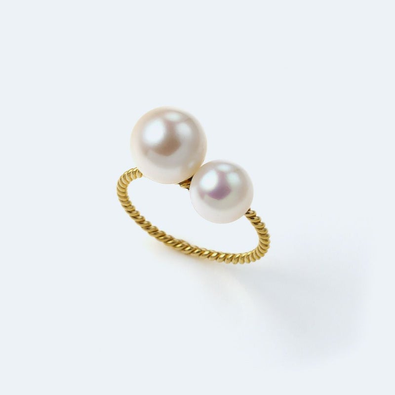 二つのパールがぴったりと寄り添い、18kのアームは固く結ばれた絆の如く、絞ったようにデザインし、とてもRomanticな雰囲気を出しています。 清楚なパールは暖かそうな冬服はもちろん、真反対のライダーズジャケットにも合うContemporaryなデザインです。年齢を問わず付けれるジュエリーです。